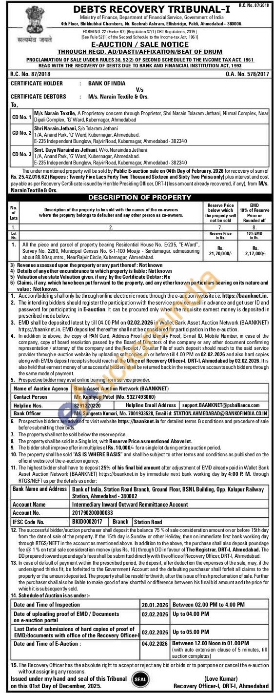 All the piece and parcel of property bearing Residential House No. E/235, "E-Ward", Survey No. 2260, Municipal Census No. 6-1-100 Mouje Sardarnagar, admeasuring about 88.80sq.mtrs., Near Rajvir Circle, Kubermagar, Ahmedabad.