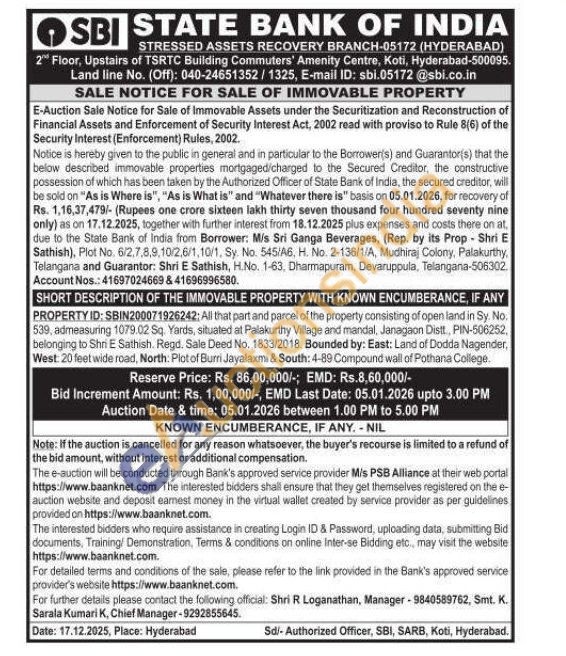 All that part and parcel of the property consisting of open land in Sy. No. 539, admeasuring 1079.02 Sq. Yards, situated at Palakurthy Village and mandal, Janagaon Distt., PIN-506252, belonging to Shri E Sathish. Regd. Sale Deed No. 1833/2018. Bounded by: East: Land of Dodda Nagender, West: 20 feet wide road, North: Plot of Burri Jayalaxmi & South: 4-89 Compound wall of Pothana College.