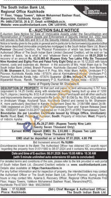 DESCRIPTION OF PROPERTY: All that part and and parcel of land admeasuring 5.767 Ares (equivalent to 14.25 Cents) along with residential building having built up area of 1200 Sq Ft. (Approx.) bearing No. 8/32 A of Unnikulam Grama Panchayath and all other usufructs and improvements thereon, comprised in Re Sy No. 39/18 (Old Sy. No. 55/4, 42/2) situated in Unnikulam Village, Koylland Taluk, Kozhikode District and owned by Mr. Shameem K. more particularly described in Kanam Assignment Deed No. 2138/1986 dated 24-06-1986 (registered on 29-07-1986) of SRO Thamarassery Town and Kanam Release Dend No. 1009/2017 dated 31-03-2017 (registered on 11-04-2017) of SRO Thamarassery Town. Boundaries (As per Location Certificate issued by Village Office, Unnikulam): North: Road, East: Properly of Kumaran; South: Properly of Imbichan; West: Property of Imbichi Ayisha