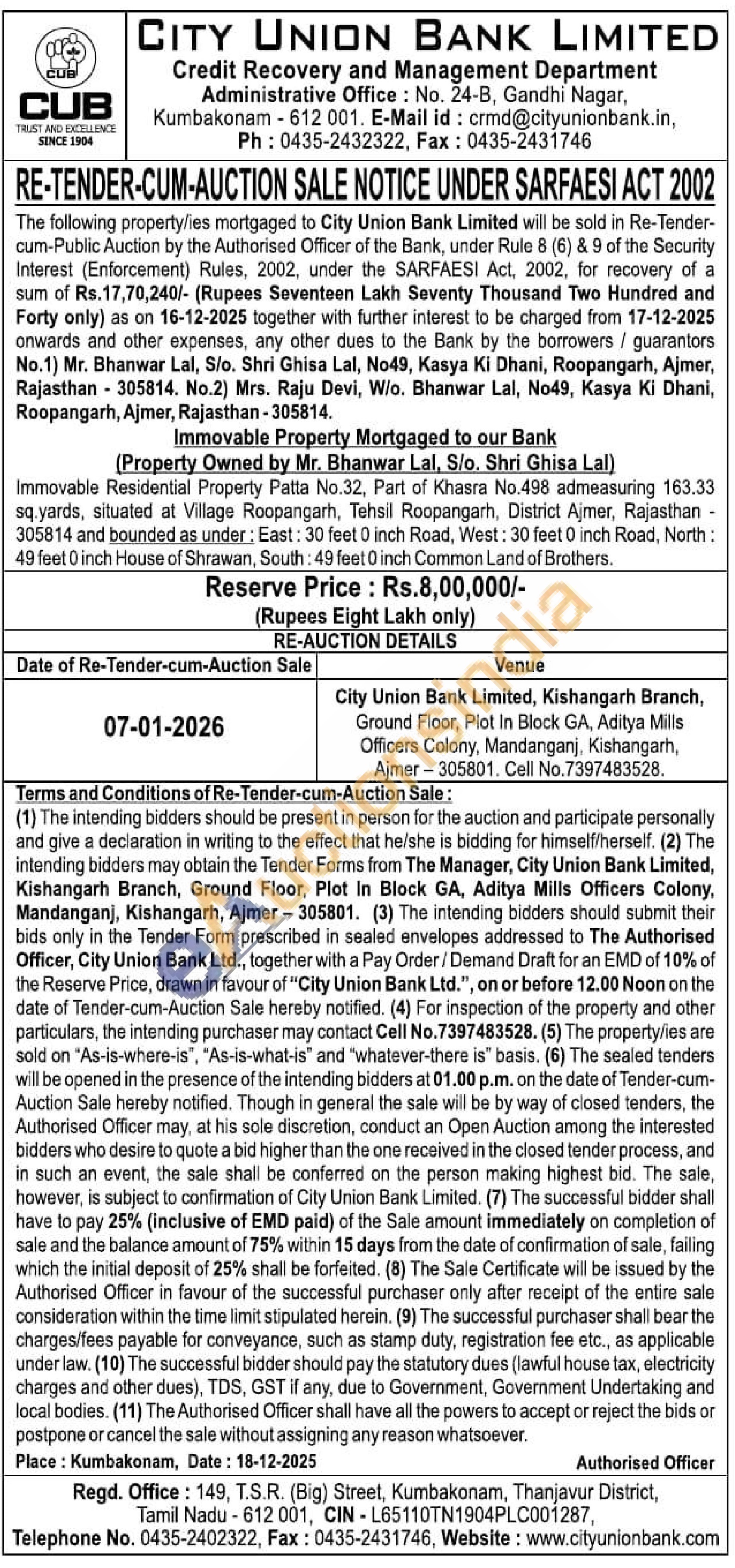 Immovable Residential Property Patta No.32, Part of Khasra No.498 admeasuring 163.33 sq.yards, situated at Village Roopangarh, Tehsil Roopangarh, District Ajmer, Rajasthan 305814 and bounded as under: East: 30 feet 0 inch Road, West: 30 feet 0 inch Road, North: 49 feet 0 inch House of Shrawan, South: 49 feet 0 inch Common Land of Brothers.
