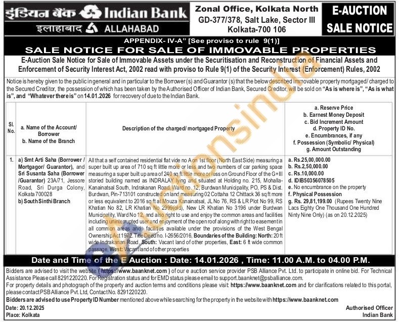 All that a self contained residential flat vide no A on 1st floor (North East Side) measuring a super built up area of 710 sq ft little more or less and two numbers of car parking space measuring a super built up area of 240 sq ft little more or less on Ground Floor of the G+III storied building named as INDRALAY lying and situated at Holding no. 215, Mohalla-Kanainatsal South, Indrakanan Road, Ward no. 12, Burdwan Municipality, PO, PS & Dist. Burdwan, Pin-713101 constructed on land measuring 02 Cottaha 12 Chittack 36 sq ft more or less equivalent to 2016 sq ft at Mouza Kanainatsal, JL No 76, RS & LR Plot No 99, RS Khatian No 82, LR Khatian No 2999 (old), New LR Khatian No 3196 under Burdwan Municipality, Ward No 12, and also right to use and enjoy the common areas and facilities including uninterrupted user and enjoyment of the open roof along with right to easementin all common areas and facilities available under the provisions of the West Bengal OwnershipAct 1972. Title Deed no. 1-2656/2016, Boundaries of the Building: North: 20 ft wide Indrakanan Road, South: Vacant land of other properties, East: 6 ft wide common passage, West: Vacant land of other properties