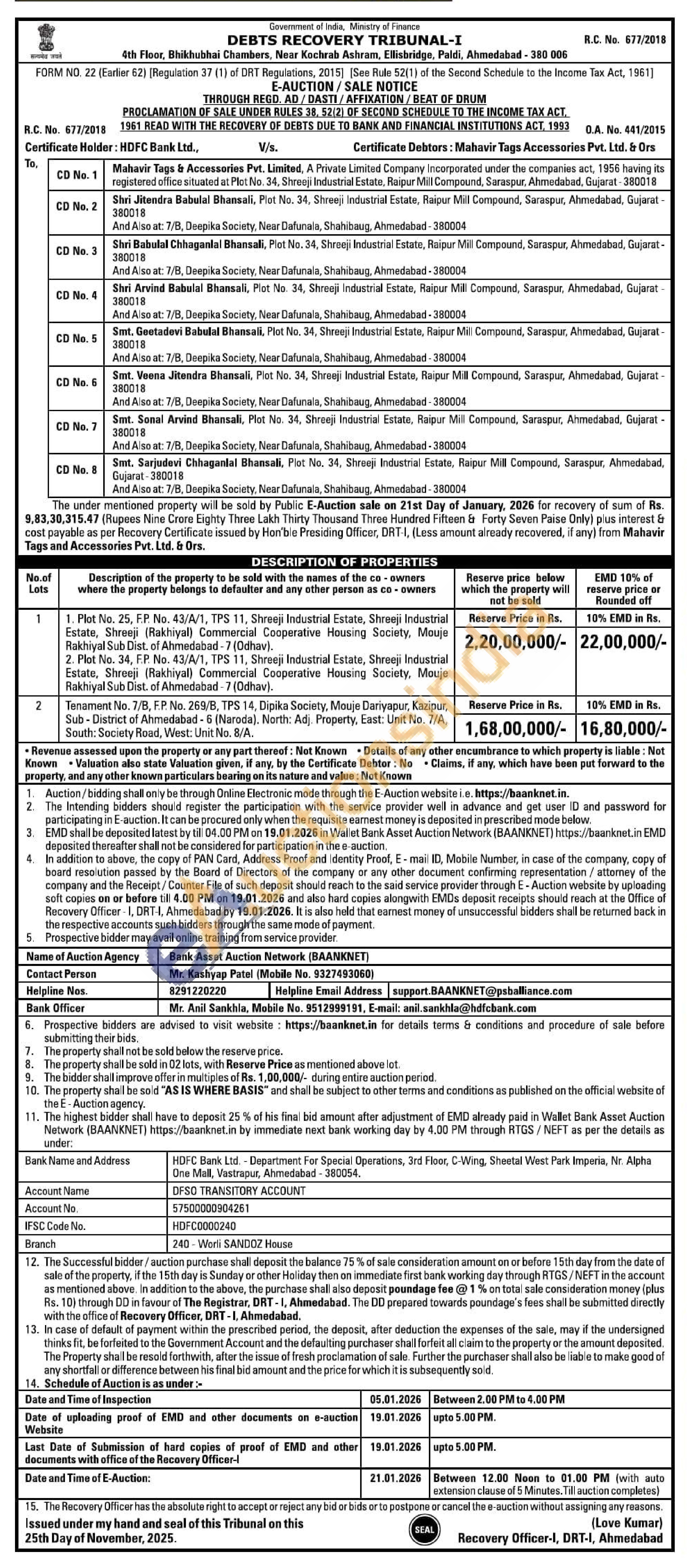 Plot No. 25, F.P. No. 43/A/1, TPS 11, Shreeji Industrial Estate, Shreeji Industrial Estate, Shreeji (Rakhiyal) Commercial Cooperative Housing Society, Mouje Rakhiyal Sub Dist. of Ahmedabad - 7 (Odhav). 2. Plot No. 34, F.P. No. 43/A/1, TPS 11, Shreeji Industrial Estate, Shreeji Industrial Estate, Shreeji (Rakhiyal) Commercial Cooperative Housing Society, Mouje Rakhiyal Sub Dist. of Ahmedabad - 7 (Odhav).