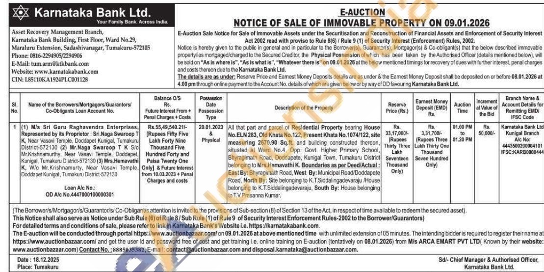 All that part and parcel of Residential Property bearing House No.ELN 283, Old Khata No. 122, Present Khata No. 1074/122, site measuring 2670.90 Sq.ft. and bulliding constructed thereon, situated at Ward No.4, Opp: Govt. Higher Primary School, Bhyragimath Road, Doddapete, Kunigal Town, Tumakuru District belonging to Mrs.Hemavathi K. Boundaries as per Deed/Actual: East By: Bhyragimath Road, West By: Municipal Road/Doddapete Road, North By: Site belonging to K.T.Siddalingadevaraju /House belonging to K.T.Siddalingadevaraju, South By: House belonging to T.V.Prasanna Kumar.