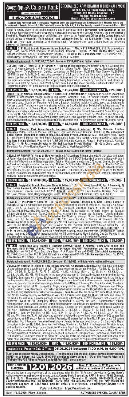 All that piece and parcel of land admeasuring a total extent of 1,11,751 square feet spread across Plot Nos. A3, B1, B2, B3, C1, C2, C3 D1, D2, D3, E1, E2, E3, F1, F2, F3, G1, G2, G3, H1, H2, H3, 11, 12, 13, 14, J1, J2, J3, J4, K1, K2, K3, K4, L1, L2, L3, L4, M1, M2, M3, M4 Situated in the approved layout of Sri Ganapathy Nagar, comprised in Survey No.383/2, Semmancheri Village, Sholinganallur Taluk, Kancheepuram District situated within the limits of the Registration District of Chennai South and Registration Sub-District of Neelankarai. Item No.II: All that piece and parcel of the land admeasuring a total extent of 6195 sq.ft bearing Plot Nos. A1 and A2, Situated in the approved layout of Sri Ganapathy Nagar, comprised in Survey No.383/2, Semmancheri Village, Sholinganallur Taluk, Kancheepuram District situated within the limits of the Registration District of Chennai South and Registration Sub-District of Neelankarai. Bounded on the: North by: 30' Wide Road, South by: Plot No.A3, East by: Survey No.378/1A and West by: 20 Wide Road. Item No.III: All that piece and parcel of the land in the nature of a private passage admeasuring a total extent of 12,800 square feet situated in the approved layout of Sri Ganapathy Nagar, comprised in Survey No.383/2, Semmancheri Village, Sholinganallur Taluk, Kancheepuram District situated within the limits of the Registration District of Chennai South and Registration Sub-District of Neelankarai. Bounded on the: North by: 30' Wide Road, South by: Plot No.H1, East by: Plot Nos.A1, A2, A3, B1, B2, B3, C1, C2, C3, D1, D2, D3, E1, E2, E3, F1, F2, F3, G1, G2, G3 and H1, West by: Plot Nos. H2, H3, 11, 12, 13, 14, J1, J2, J3, J4, K1, K2, K3, K4, L1, L2, L3, L4, M1, M2, M3 and M4. Item No.IV: All that piece and parcel of undivided share of land to an extent of 803 square feet proportioned as 687 square feet in Item No.1 Property, 38 square feet in Item No.Il Property and 78 square feet in Item No.III Property mentioned hereinabove situated in the approved layout of Sri Ganapathy Nagar, comprised in Survey No.383/2, Semmancheri Village, Sholinganallur Taluk, Kancheepuram District situated within the limits of the Registration District of Chennal South and Registration Sub-District of Neelankaral along with the residential apartment bearing Flat No.WP-2, situated in the Second Floor, in Block No.W of the building named, 'Ambrosia", having a super built up area of 1133 square feet, (inclusive of plinth area of 911 square feet, undivided share to an extent of 164 square feet in the common areas and undivided share to an extent of 58 square feet in the Club House and a private terrace area of 717 square feet constructed thereon.