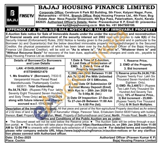 Property described as: An extend Description of the Immovable Property; All that piece and parcel of the Non-agricultural of 2.02 Ares of land in Sy No. 286/4/3 of Karumallur Village, Paravoor Taluk, Emakulam District 683511along with building thereon, East: Property of Sudheeshan, West: Property of Sethumadhavan and Canal, North: Private Road, South: Canal.