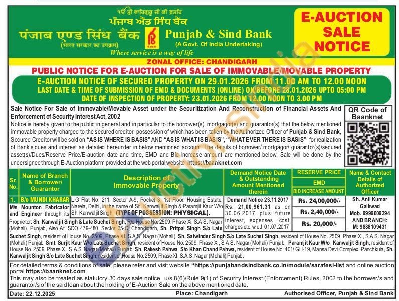 LIG Flat No. 211, Sector A-9, Pocket 3, 1st Floor, Housing Estate Narela, Delhi, in the name of Sh. Kanwaljit Singh & Paramjit Kaur W/o Sh. Kanwaljit Singh