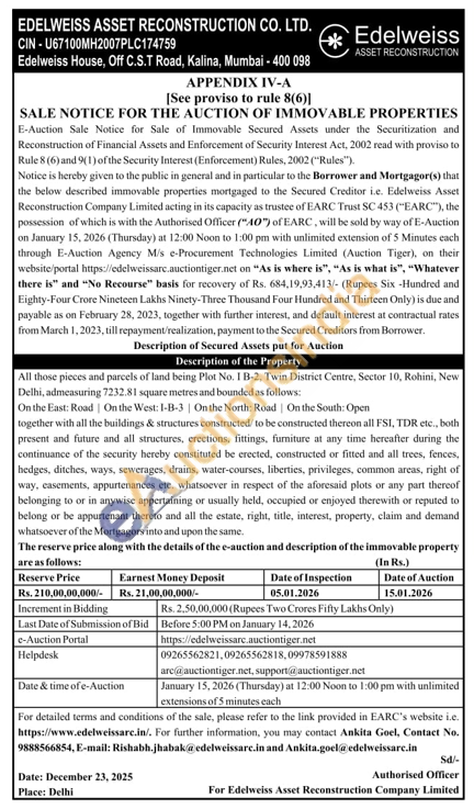 All those pieces and parcels of land being Plot No. 1 B-2, Twin District Centre, Sector 10, Rohini, New Delhi, admeasuring 7232.81 square metres and bounded as follows: On the East: Road | On the West: I-B-3 | On the North: Road On the South: Open