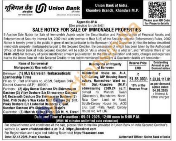 Residential House no. Al-A. LIG. Colony, MP Housing Board colony, Rameshwar Ward no. 47, Dist.-Khandwa (M.P.) admeasuring 2689.24 sq.ft. owned ny Manish Tiwari (Guarantor), Boundaries: North-Nala Open Land or Road, South-Colony House No. A/33 LIG, East Nala, West: Colony House No. A/T LIG