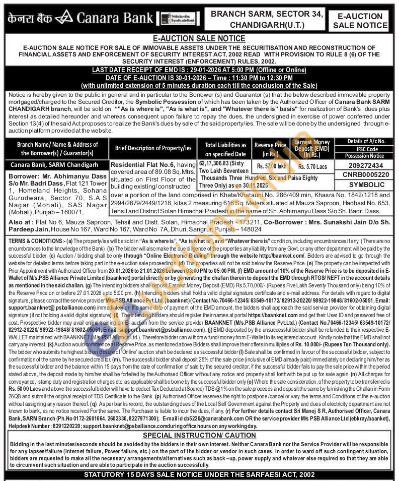 Residential Flat No.6, having 62,17,306.83 (Sixty covered area of 89.08 Sq.Mtrs. situated on First Floor of the building existing/constructed over a portion of the land comprised in Khata/Khatauni No. 286/409 min, Khasra No. 1842/1218 and 2994/2679/2449/1218, kitas 2 measuring 616 Sq. Meters situated at Mauza Saproon, Hadbast No. 653. Tehsil and District Solan Himachal Pradesh in the name of Sh. Abhimanyu Dass S/o Sh. Badri Dass
