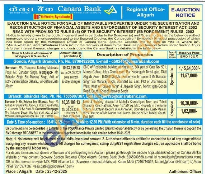 Residential building at Khata No. 664 part of Gata No. 501, Mauza Gahlau, Iglas-Gonda road, Par Hasangarh Tehsil-lglas, Distt Aligarh, Area- 1540.00 Sq Mtr., Property in the name of Mr. Bahadur Singh Sio Maharaj Singh, Bounded as: East: Plot of Dharmendra, West: Khet of Rajveer Singh & Jagveer Singh, North: Iglas-Gonda Road, South: Khet of Manveer Singh