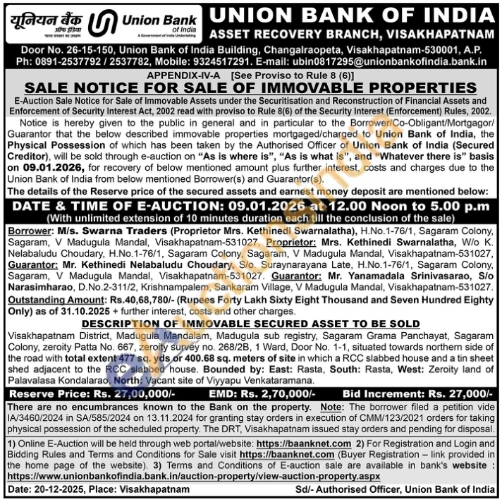 Visakhapatnam District, Madugula Mandalam, Madugula sub registry, Sagaram Grama Panchayat, Sagaram Colony, zeroity Patta No. 667, zeroity survey no. 268/2B, 1 Ward, Door No. 1-1, situated towards northern side of the road with total extent 477 sq. yds or 400.68 sq. meters of site in which a RCC slabbed house and a tin sheet. shed adjacent to the RCC slabbed house. Bounded by: East: Rasta, South: Rasta, West: Zeroity land of Palavalasa Kondalarao, North: Vacant site of Viyyapu Venkataramana.