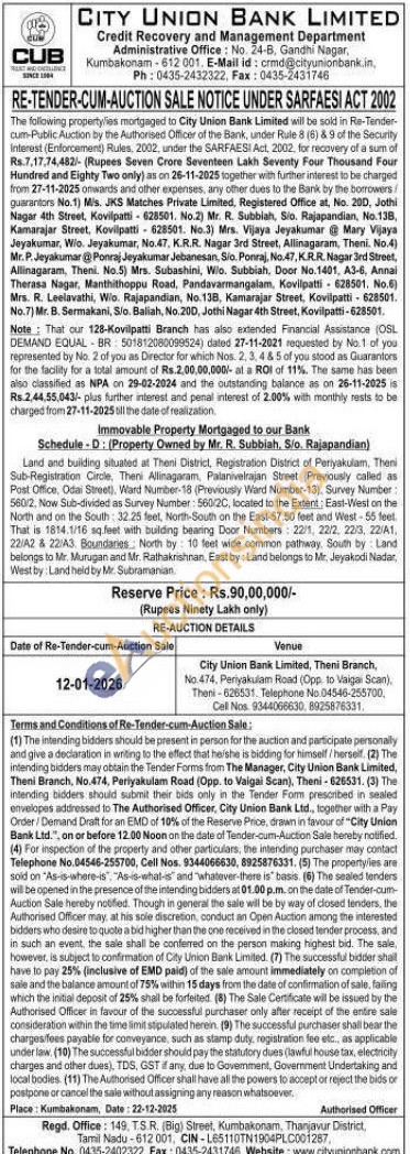 Land and building situated at Theni District, Registration District of Periyakulam, Theni Sub-Registration Circle, Theni Allinagaram, Palanivelrajan Street (Previously called as Post Office, Odai Street), Ward Number-18 (Previously Ward Number-13). Survey Number: 560/2, Now Sub-divided as Survey Number: 560/2C, located to the Extent: East-West on the North and on the South: 32.25 feet, North-South on the East-57.50 feet and West-55 feet. That is 1814.1/16 sq.feet with building bearing Door Numbers: 22/1, 22/2,22/3, 22/A1. 22/42 & 22/A3. Boundaries: North by 10 feet wide common pathway, South by: Land belongs to Mr. Murugan and Mr. Rathakrishnan, East by: Land belongs to Mr, Jeyakodi Nadar, West by: Land held by Mr. Subramanian
