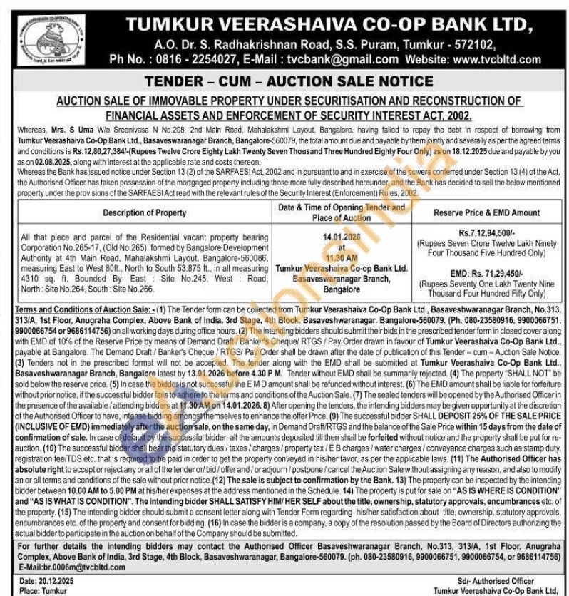 All that piece and parcel of the Residential vacant property bearing Corporation No.265-17, (Old No.265), formed by Bangalore Development Authority at 4th Main Road, Mahalakshmi Layout, Bangalore-560086, measuring East to West 80ft., North to South 53.875 ft., in all measuring 4310 sq. ft. Bounded By: East Site No.245, West Road, North: Site No.264, South: Site No. 266.