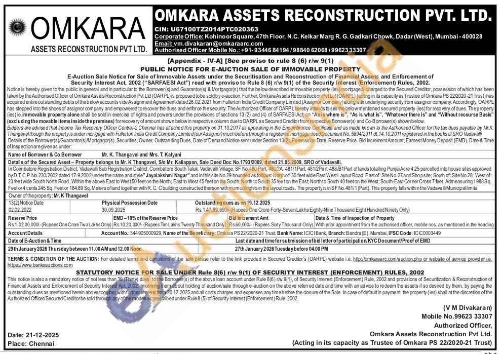 In Coimbatore Registration District, Vadavalli Sub Registration District, Coimbatore South Taluk, Vadavalli Village, SF No. 480 Part, 480/2A, 481/1Part, 481/2Part, 488/B1Part of lands totalling Punjai Acre 4.25 parcelled into house sites approved by D.T.C.P. No. 230/2002 dated 17.9.2002 under the name and style" Jayalakshmi Nagar" and in this site No.29 bounded as follows: North of: 30 feet wide East West Layout Road; East of: Site No. 27 and Shopsite; South of: Site No.28; West of: 23 feet wide South North Road, Within the above East to West 50 feet on the North; East to West 45 feet on the South: North to South 35 feet on the East: North to South 40 feet on the West: South-East Corner Cross 7 feet. Admeasuring 1988 Sq. Feet or 4 cents 245 Sq. Feet or 184.69 Sq. Meters of land together with R. C. C building constructed thereon with mamoolrights in the layout roads. The property is in SF No. 481/1 (Part). This property falls within the Vadavalli Municipal limits.