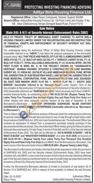 ALL THAT PIECE AND PARCEL OF FLAT NO. 8, ADMEASURING CARPET AREA 418 SQ. FT., I.E. BUILT-UP AREA 523 SQ. FT. + TERRACE CARPET 60 SQ. FT. LE BUILT-UP 75 SQ. FT., TOTAL SALLEABLE AREA 560 SQ. FT. I.E. 52.04 SQ. MTRS., ON THE FIRST FLOOR IN WING NO. A. IN THE PROJECT KNOWN AS "VIGHNAHARTA HERITAGE", MUMBAI HIGHWAY, SITUATED & CONSTRUCTED ON LAND BEARING SURVEY NO. 15, HISSA NO. 20/21B AT VILLAGE AMBEGAON BUDRUK, PUNE, WITHIN THE JURISDICTION OF SUBREGISTRAR HAVELI, AND WITHIN THE JURISDICTION OF PUNE MUNICIPAL CORPORATION, PUNE, MAHARASHTRA-411046, AND, BOUNDED AS: EAST: SIDE MARGIN WEST FLAT NO. 1, NORTH: FLAT NO. 7, SOUTH: SIDE MARGIN