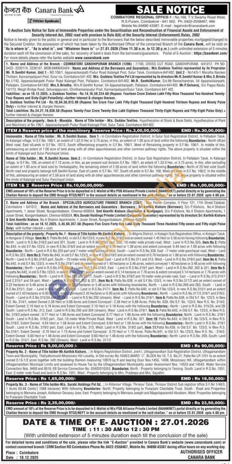 Property No. 2 Name of Title holder-Mr.Karthik Kishore. In Nilgiris Registration District, Joint I, Uthagamandlam Sub Registration District, Uthagamandlam Town and Municipality, Thaliyattumund-Missionary Hill Locality, in Old survey No. 1049/3, WARD "J", BLOCK No. 10. T.S. No.21, Patta No-LR 1251 to an extent owned 0.13-1/2 acres together with the building thereon measuring 10970 sq ft and bearing Door Nos. 1456, 145N, Missionary Hill, Uthagamandlam within Uthagamandlam Municipal Limits and assessed to House Tax by the Uthagamandlam Municipality under Assessment Nos. 14523 and 14543. Water Service Connection Nos 9469 and 9519, EB Service Connection No. 03402010353. Boundaries: North Property belonging to Tenzing. South: Land in R.S.No. 1051. East 3 meter wide Road and land in R.S.No. 1051. West: Property belonging to Mrs. Pradeepa and Mrs. Gayathri