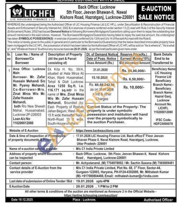 Ek Kita H. No. 39/A, situated at Hata Mirza Ali Khan, Ward- Husainabad, Tehsil & Distt Lucknow. Area 1250 Sq.ft. i.e. 116.171 sq.mtr in the name of Mrs. Zinat Mirza