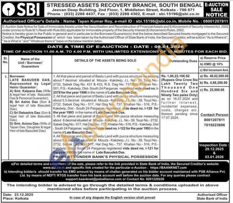 All that piece and parcel of Bastu Land with pucca structure measuring about 7 decimal situated at Mouza-Kakdwip, J.L. No.- 39, Touzi No. 2732. Sabek Dag No. 431 & 433, R.S. Dag No. 737/894, Khatian No.-501, P.S.-Kakdwip, Dist-South 24 Parganas registered vide deed no. I-2578 for the year 1996 in the name of Late Basudeb Das. 2. All that piece and parcel of Bastu Land with pucca structure measuring about 5.5 decimal situated at Mouza-Kakdwip, J.L. No.- 39, Touzi No.-2732, Sabek Dag No.- 517, Hal Dag No.- 737, Khatian No.- 516, P.S.-Kakdwip, Dist South 24 Parganas registered vide deed no. 1-120 for the year 1993 in the name of Late Basudeb Das. 3. All that piece and parcel of Bastu Land with pucca structure measuring about 6 decimal situated at Mouza-Kakdwip, J.L. No.-39, Touzi No.-2732, Sabek Dag No.-517, Hal Dag No.-737, Khatian No.-516, P.S.-Kakdwip, Dist -South 24 Parganas registered vide deed no. 1-122 for the year 1993 in the name of Late Basudeb Das. 4. All that piece and parcel of Bastu Land with pucca structure measuring about 5.5 decimal situated at Mouza-Kakdwip, J.L. No.-39. Touzi No.-2732, Sabek Dag No.- 517, Hal Dag No.- 737, Khatian No.-516, P.S.-Kakdwip, Dist-South 24 Parganas registered vide deed no. 1-121 for the year 1993 in the name of Late Basudeb Das.