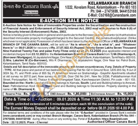 Details and full description of the immovable property with known encumbrances, if any. Details of Property: TYPE: All that piece and parcel of two bedroom flat bearing Flat No G2 in Ground floor, UDS 205 Sq. ft out of 3024 Sq. Ft. and Plinth area of 855 Sq.Ft Apartment known as Grahamaliga Gayathri Apartments situated at old survey no 207/2 part, New survey no 207/26, Door Old No 2/41, New No 2/236, Pattdathamman Koil Street, Periyaapillari, No 46, Thaiyur A village Chengalpet Taluk, Kancheepuram District, Pin code-601 103. Bounded on the: North: Land and Building belongs to Kamala, South: Land and Building belongs to Annavel, East: Pattindamman Kovil Street, West: Land and Building belongs to Devendiran. Property standing in the name of Mr. Dharmaraj K
