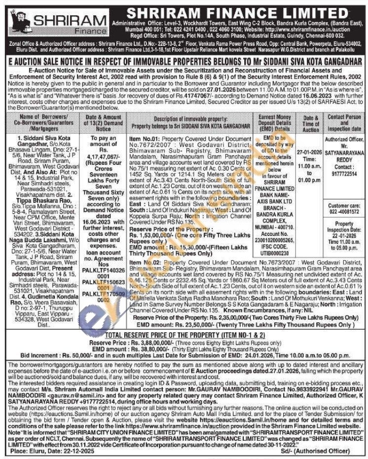 Item No.02: Property Covered Under Document No.7673/2007: West Godavari District, Bhimavaram Sub-Registry, Bhimavaram Mandalam, Narasimhapuram Gram Panchayat area and village accounts wet land covered by RS No.75/1 Measuring net undivided extent of Ac. 0.46.125 Cents or 2232.45 Sq. Yards or 1860.67 Sq Meters out of full extent of Ac.3.43 Cents North-South Side of full extent of Ac. 1.23 Cents, out of it on western side an extent of Ac.0.61% Cents on its north side with all easement rights with in the following boundaries: East: Land Of Marella Venkata Satya Radha Manohara Rao; South: Land Of Mothukuri Venkanna; West: Land In Same Survey Number Belongs S S Kota Gangadaram & E Nagaraju; North: Irrigation Channel Covered Under RS No. 135. Known Encumbrances, if any: NIL