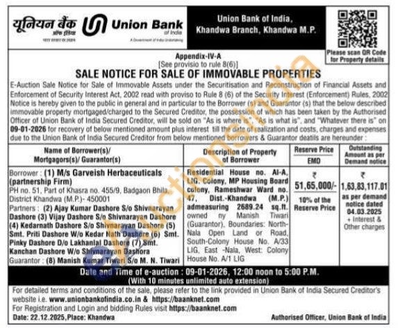 Residential House no. Al-A, LIG. Colony, MP Housing Board colony, Rameshwar Ward no. 47, Dist.-Khandwa (M.P.) admeasuring 2689.24 sq.ft. owned ny Manish Tiwari (Guarantor), Boundaries: North-Nala Open Land or Road. South-Colony House No. A/33 LIG, East -Nala, West: Colony House No. A/1 LIG