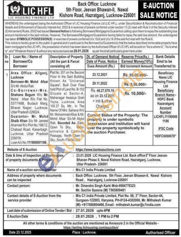Fiat No. 201 on the Second Floor In the Said Building Known As "Universal Square, Built Over Free hold Plot of Land No. 8-152 Situate at Sector-A. Mahanagar Awasiya Grah Yojna. Lucknow, Area 100.37 Sq. Mir., In The Name Of Mrs. Sahana Wo Mr. Mohammad Afsar & Mr. Mohd Afsar S/o Mr. Abdul Rab. Bounded As- East Open To Sky. West-entrance & Common Passage, North-Open To Sky, South-Flat No.202