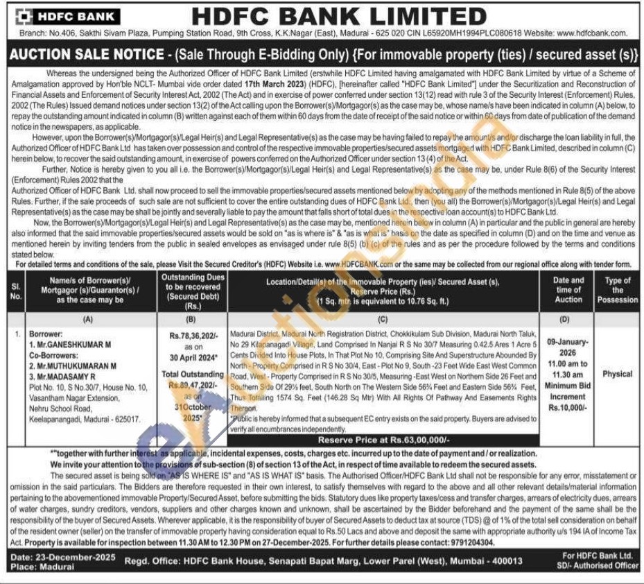Madurai District, Madurai North Registration District, Chokkikulam Sub Division, Madurai North Taluk, No 29 Kilapanagadi Village, Land Comprised in Nanjai R S No 30/7 Measuring 0.42.5 Ares 1 Acre 5 Cents Divided Into House Plots, In That Plot No 10, Comprising Site And Superstructure Abounded By North-Property Comprised in RS No 30/4, East-Plot No 9, South-23 Feet Wide East West Common Road, West-Property Comprised in R S No 30/5, Measuring -East West on Northern Side 26 Feet and Southern Side Of 29 1/2feel, South North on The Western Side 56 3/4 Feet and Eastern Side 56 3/4 Feet. Thus Totalling 1574 Sq. Feet (146.28 Sq Mtr) With All Rights Of Pathway And Easements Rights Thereon.Public is hereby informed that a subsequent EC entry exists on the said property. Buyers are advised to verify all encumbrances independently,