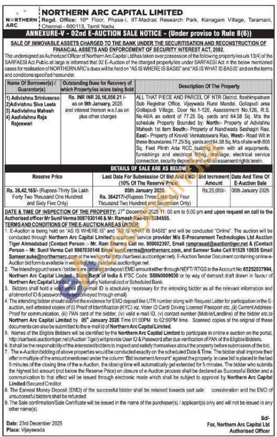 ALL THAT PIECE AND PARCEL OF NTR District, Ibrahimpatnam Sub Registrar Office, Vijaywada Rural Mandal, Gollapudi area Gollapudi Village, Door No. 1-126, Assessment No.126, R.S. No. 40/A an extent of 77.25 Sq yards and 64.58 Sq. Mts the schedule Property Bounded by: North: Property of Adivishnu Mahesh 1st item South: Property of Nandiwada Seshagiri Rao, East:- Property of Krovidi Venkateswara Rao, West:- Road Wit in these Boundaries 77.25 Sq yards and 64.58 Sq. Mts of site with 805 Sq. Feet Plinth Arla RCC building therin with all equipments, furnishings and electrical fitting, drainage, electrical service connection, security deposite and with all easement rights terein.