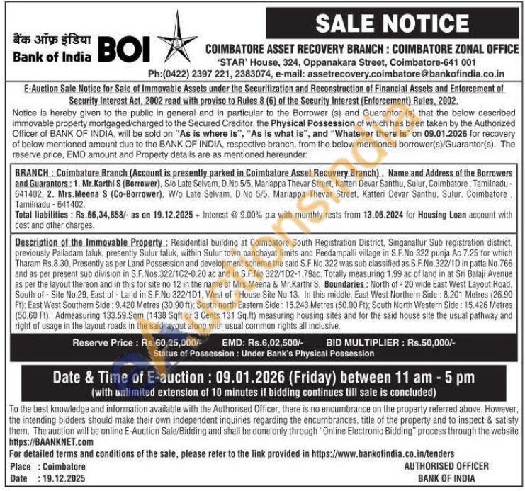 Description of the Immovable Property: Residential building at Coimbatore South Registration District, Singanallur Sub registration district, previously Palladam taluk, presently Sulur taluk, within Sulur town panchayat limits and Peedampalli village in S.F.No 322 punja Ac 7.25 for which Tharam Rs.8.30. Presently as per Land Possession and development scheme the said S.F.No.322 was sub classified as S.F.No.322/1D in patta No.766 and as per present sub division in S.F.Nos.322/1C2-0.20 ac and in S.F.No 322/102-1.79ac, Totally measuring 1.99 ac of land in at Sri Balaji Avenue as per the layout thereon and in this for site no 12 in the name of Mrs. Meena & Mr.Karthi S. Boundaries: North of -20'wide East West Layout Road, South of Site No.29, East of Land in S.F.No 322/101, West of House Site No 13. In this middle, East West Northern Side: 8.201 Metres (26.90 Ft); East West Southern Side: 9.420 Metres (30.90 ft): South north Eastern Side: 15.243 Metres (50.00 Ft); South North Western Side: 15.426 Metres (50.60 Ft). Admeasuring 133.59.Sqm (1438 Sqft or 3 Cents 131 Sq.ft) measuring housing sites and for the said house site the usual pathway and right of usage in the layout roads in the said layout along with usual common rights all inclusive.