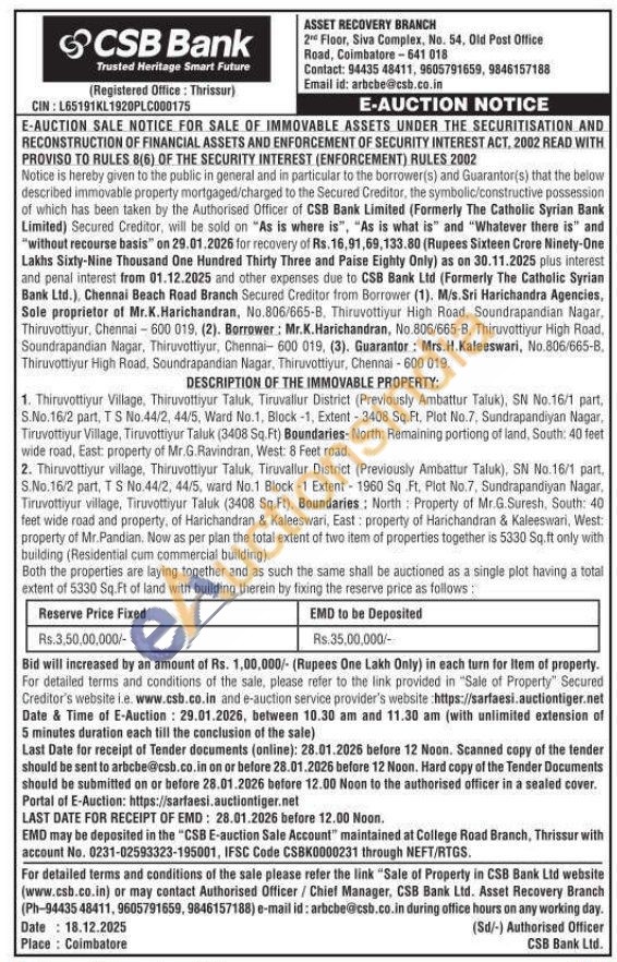 Thiruvottiyur Village, Thiruvottiyur Taluk, Tiruvallur District (Previously Ambattur Taluk), SN No.16/1 part, S.No.16/2 part, T S No.44/2, 44/5, Ward No.1, Block-1, Extent-3408 Sq. Ft, Plot No.7, Sundrapandiyan Nagar, Tiruvottiyur Village, Tiruvottiyur Taluk (3408 Sq. Ft) Boundaries- North: Remaining portiong of land, South: 40 feet wide road, East: property of Mr.G.Ravindran, West: 8 Feet road. 2. Thiruvottiyur village, Thiruvottiyur Taluk, Tiruvallur District (Previously Ambattur Taluk), SN No.16/1 part, S.No.16/2 part, T S No.44/2, 44/5, ward No.1 Block-1 Extent 1960 Sq Ft, Plot No.7, Sundrapandiyan Nagar, Tiruvottiyur village, Tiruvottiyur Taluk (3408 Sq.Ft). Boundaries: North Property of Mr.G.Suresh, South: 40 feet wide road and property, of Harichandran & Kaleeswari, East: property of Harichandran & Kaleeswari, West: property of Mr. Pandian. Now as per plan the total extent of two item of properties together is 5330 Sq.ft only with building (Residential cum commercial building). Both the properties are laying together and as such the same shall be auctioned as a single plot having a total extent of 5330 Sq. Ft of land with building therein by fixing the reserve price as follows: