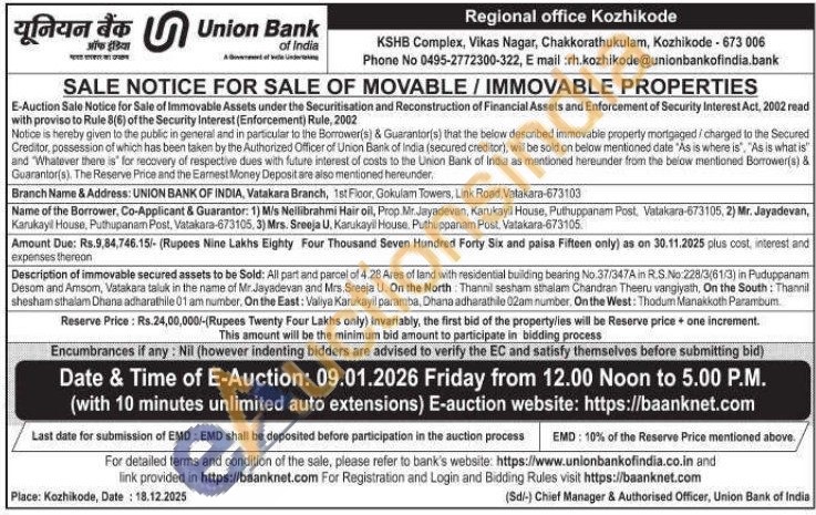 Description of immovable secured assets to be Sold: All part and parcel of 4.28 Ares of land with residential building bearing No.37/347A in R.S.No 228/3(61/3) in Puduppanam Desom and Amsom, Vatakara taluk in the name of Mr.Jayadevan and Mrs.Sreeja U. On the North: Thannil sesham sthalam Chandran Theeru vangiyath, On the South: Thannil shesham sthalam Dhana adharathile 01 am number, On the East: Valiya Karukayil paramba, Dhana adharathle 02am number. On the West: Thodum Manakkoth Parambum