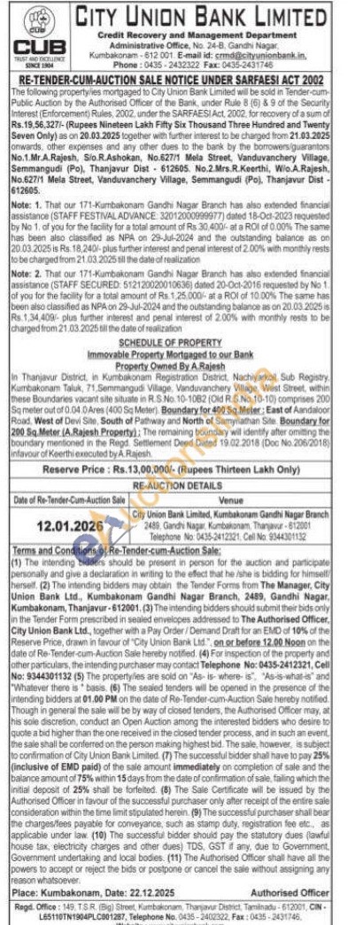 In Thanjavur District, in Kumbakonam Registration District, Nachiyarkol Sub Registry Kumbakonam Taluk, 71.Senmangudi Village, Vanduvanchery Village, West Street, within These Boundaries vacant site situate in R.S.No. 10-1082 (Old R.5.No.10-10) comprises 200 So meter out of 0.04.0 Ares (400 Sq Meter) Boundary for 400 50 Meter: East of Aandaloor Road, West of Devi Site, South of Pathway and North of Samynathan Site Boundary for 200 Sq.Meter (A.Rajesh Property); The remaining boundary will identify after omitting the boundary mentioned in the Flagd. Settlement Deed Dated 19.02.2018 (Doc No 206/2018) infavour of Keerthi executed by A Rajesh