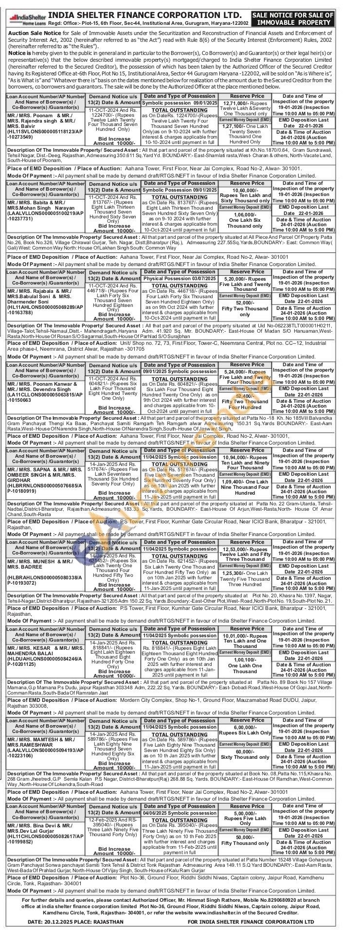 Description Of The Immovable Property/ Secured Asset: All that part and parcel of the property situated at Uid No-062238TLT000001H0211, Village-Talot, Tehsil-Namaul, Distt.- Mahendragarh, Haryana Adm. 41.920 Sq. Mtr. BOUNDARY:- East-House Of Madan S/O Hanuaman, West-Rasta, North-House Of Rosan S/O Sagarmal, South-House Of Parhlad S/O Surajbhan
