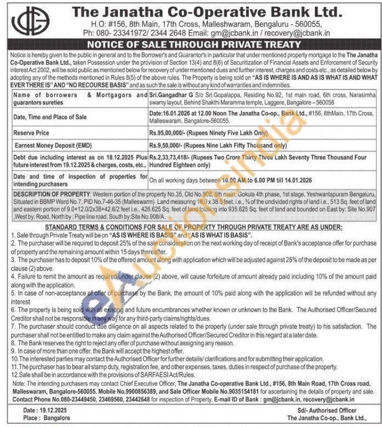 DESCRIPTION OF PROPERTY: Westem portion of the property No.35, Old No.908, 5th main, Gokula 4th phase, 1st stage, Yeshwantapuram Bengaluru, Situated in BBMP Ward No. 7, PID No.7-46-35 (Malleswarm) Land measuring 18.0 x 38.0 feet. i.e., 3/4 of the undivided rights of landi.e., 513 Sq. feet of land and eastern portion of 9.0+12.0/2x38+42.6/2 feet i.e., 426.625 Sq. feet of land totaling into 935.625 Sq. feet of land and bounded on East by: Site No.907 West by: Road, North by. Pipeline road, South by:Site No.908/A