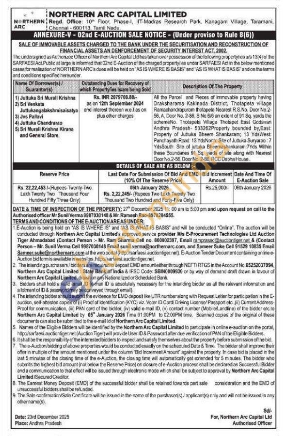 All the Parcel and Pieces of immovable property having Draksharama Kakinada District, Thotapeta village Ramachandrapuram thotapeta Nearest R.S.No. Door No.2-56, A, Door No. 2-86, S No.6/6 an extent of 91 Sq. yards the scheme No. Thotapeta Village Thotapet East Godavari Andhra Pradesh- 533262Property bounded by, East: Property of Juttuka Bheem Shankaram; 13 YdsWest: Panchayath Road: 13 YdsNorth: Site of Juttuka Suryarao: 7 YdsSouth: Site of juttuka Bheemashankaram:7Yds Within these Boundaries 91 Sq, yards of sile along with Nearest Door No.2-56, Door No, 2-86, RCC Dabha House.