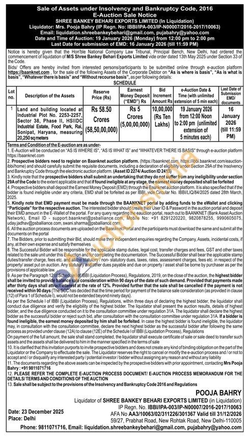 Land and building located at Industrial Plot No. 2253-2257, Sector 38, Phase II, HSIIDC Industrial Estate, Food Park, Rai, Sonipat, Haryana, measuring 20,250 sq meters