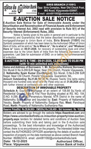 Schedule A: Equitable Mortgage of an extent of 108.88 Sq. Yards of Residential Ground Floor & First Floor Building situated at RS. NO. 154, D.NO. 6-299, Poranki, Penamaluru Mandal, NTR District in the name of Nallamothu Syam Kumar and bounded by: East: Property of Nallamothu Yesobu, South: Property of Nallamothu Sadguna Rao, West: Panchayat Road, North: Property of Nallamothu Sudharsana Rao.