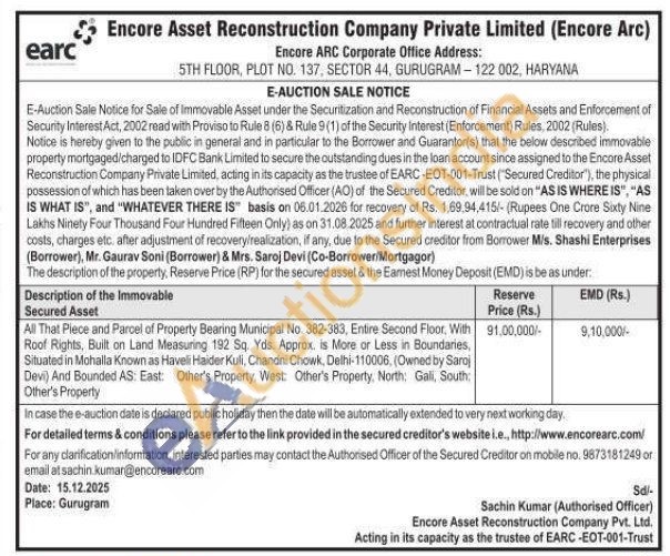 All That Piece and Parcel of Property Bearing Municipal No. 382-383, Entire Second Floor. With Roof Rights, Built on Land Measuring 192 Sq. Yds. Approx. is More or Less in Boundaries, Situated in Mohalla Known as Haveli Haider Kuli, Chandni Chowk, Delhi-110006, (Owned by Saroj Devi) And Bounded AS: East: Other's Property, West: Other's Property, North: Gali, South: Other's Property