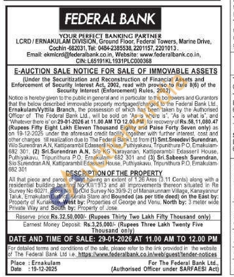 All that piece and parcel of land having an extent of 1.26 Ares (3.11 Cents) along with a residential building bearing No XII/1913 and all improvements thereon situated in Re Survey No 602/1, Block No 19 (Old Survey No 39/9-2) of Manakunnam Village, Kanayannur Taluk, Ernakulam District, Kerala Stare and Bounded (as per title deed) on the East by: Property of Kuriakose, West by: Properties of George and Venu, North by: 3 meter wide Private Way and South by: Property of Jose.