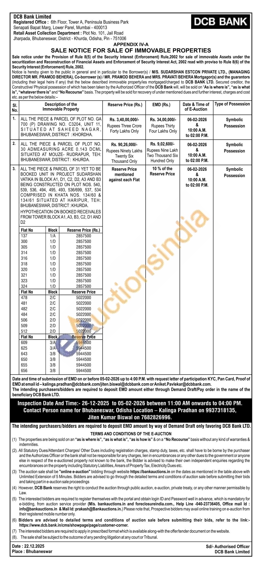 ALL THE PIECE & PARCEL OF 31 YET TO BE BOOKED UNIT IN PROJECT SUDARSHAN VATIKA IN BLOCK A1, D1, C2, D2, A3 AND B3 BEING CONSTRUCTED ON PLOT NOS. 540, 539, 536, 494, 495, 493, 536/699, 537, 534 COMPRISED IN KHATA NOS. 134/60 & 134/61 SITUATED AT HARIPUR, TEH: BHUBANESWAR, DISTRICT: KHURDA