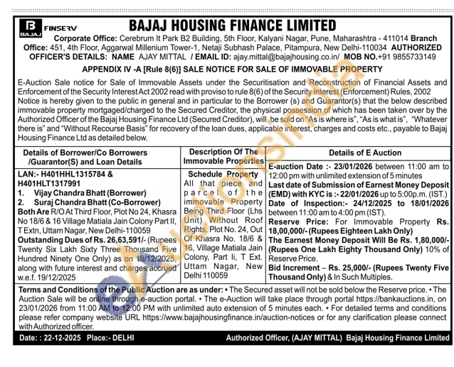Schedule Property All that piece and parcel of the immovable Property Being Third Floor (Lhs Unit) Without Roof Rights, Plot No. 24, Out Of Khasra No. 18/6 & 16, Village Matiala Jain Colony, Part li, T Ext. Uttam Nagar, New Delhi 110059