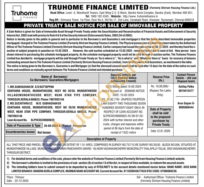 ALL THAT PIECE AND PARCEL OF LAND HAVING AN EXTENT OF 1.51 ARES, COMPRISED IN SURVEY NO.757/15.RE SURVEY NO.20/50, BLOCK NO.056, SITUATED AT MUNDATHIKODE VILLAGE, MUNDATHIKODE GRAMA PANCHAYATH (WARD-16) NOW VADAKKANCHERRY MUNCIPALITY THALAPILLY TALUK, SRO VADAKKANCHERRY, THRISSUR DISTRICT.