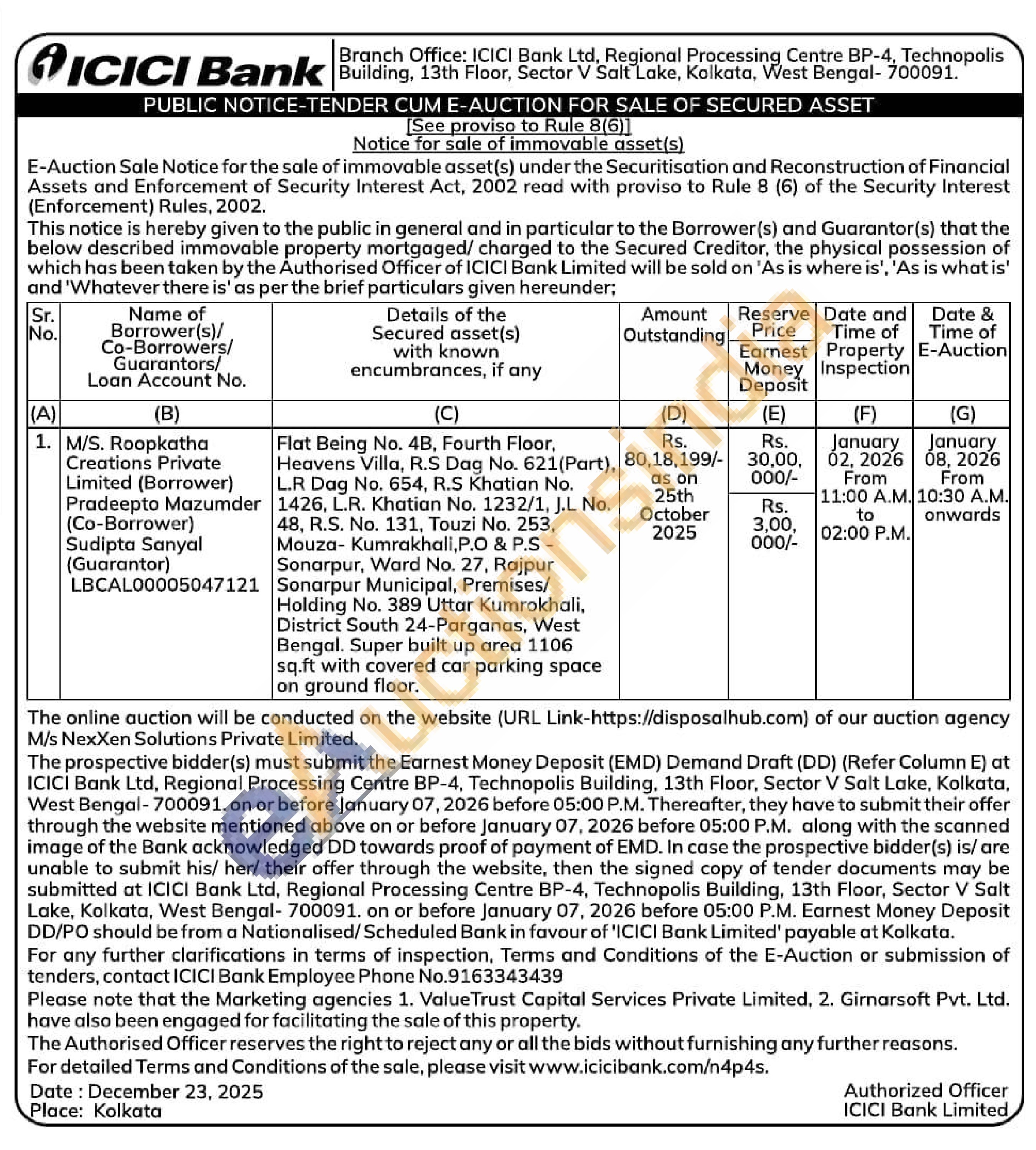 Flat Being No. 4B, Fourth Floor, Heavens Villa, R.S Dag No. 621(Part), L.R Dag No. 654, R.S Khatian No. 1426, L.R. Khatian No. 1232/1, J.L No. 48, R.S. No. 131, Touzi No. 253, Mouza-Kumrakhali, P.O & P.S -Sonarpur, Ward No. 27, Rajpur Sonarpur Municipal, Premises/Holding No. 389 Uttar Kumrokhali, District South 24-Parganas, West Bengal. Super built up area 1106 sq.ft with covered car parking space on ground floor.