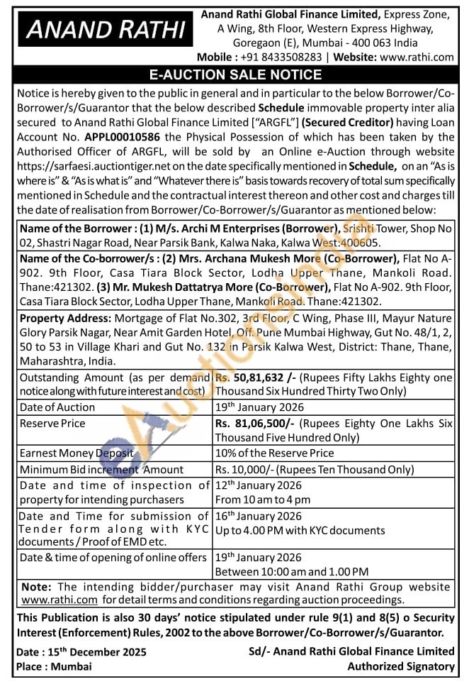 Property Address: Mortgage of Flat No.302, 3rd Floor, C Wing, Phase III, Mayur Nature Glory Parsik Nagar, Near Amit Garden Hotel, Off. Pune Mumbai Highway, Gut No. 48/1, 2, 50 to 53 in Village Khari and Gut No. 132 in Parsik Kalwa West, District: Thane, Thane, Maharashtra, India.