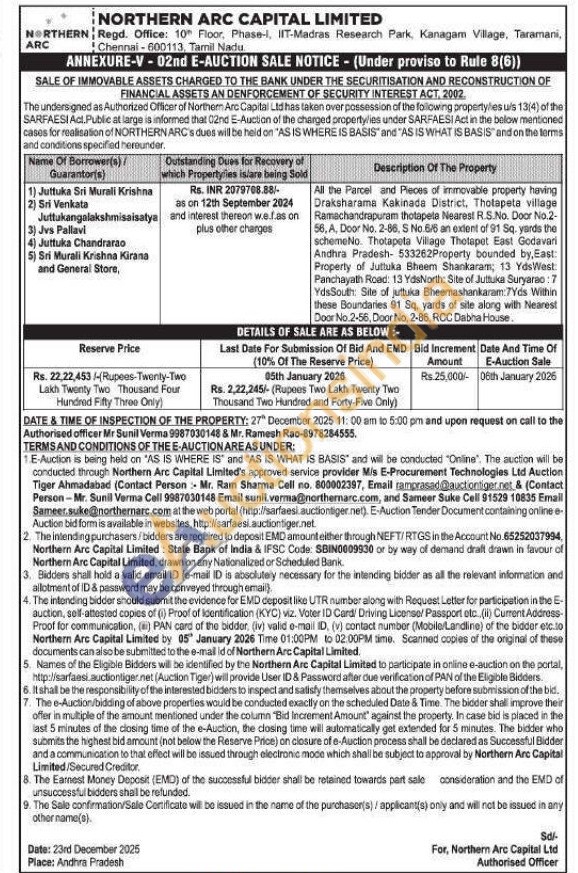 All the Parcel and Pieces of immovable property having Draksharama Kakinada District, Thotapeta village Ramachandrapuram thotapete Nearest R.S.No. Door No.2-56, A, Door No. 2-86, S No.6/6 an extent of 91 Sq. yards the scheme No. Thotapeta Village Thotapet East Godavari Andhra Pradesh-533262Property bounded by, East: Property of Juttuka Bheem Shankaram; 13 Yds West Panchayath Road: 13 YdsNorth: Site of Juttuka Suryarao: 7 YdsSouth: Site of juttuka Bheermashankaram:7Yds Within these Boundaries 91 Sq, yards of site along with Nearest Door No.2-56, Door No, 2-86, RCC Dabha House.