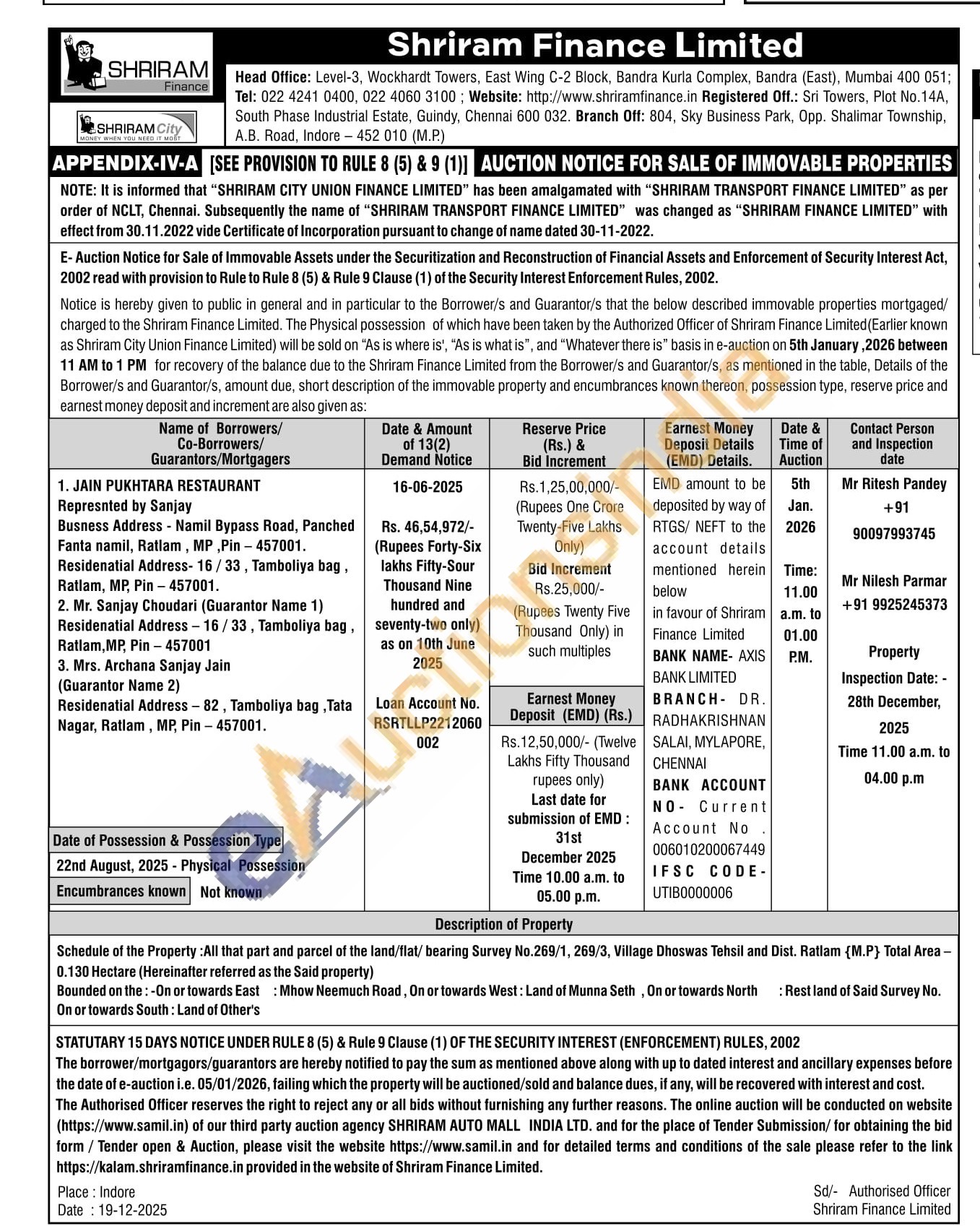 Schedule of the Property: All that part and parcel of the land/flat/bearing Survey No.269/1, 269/3, Village Dhoswas Tehsil and Dist. Ratlam (M.P) Total Area -0.130 Hectare (Hereinafter referred as the Said property