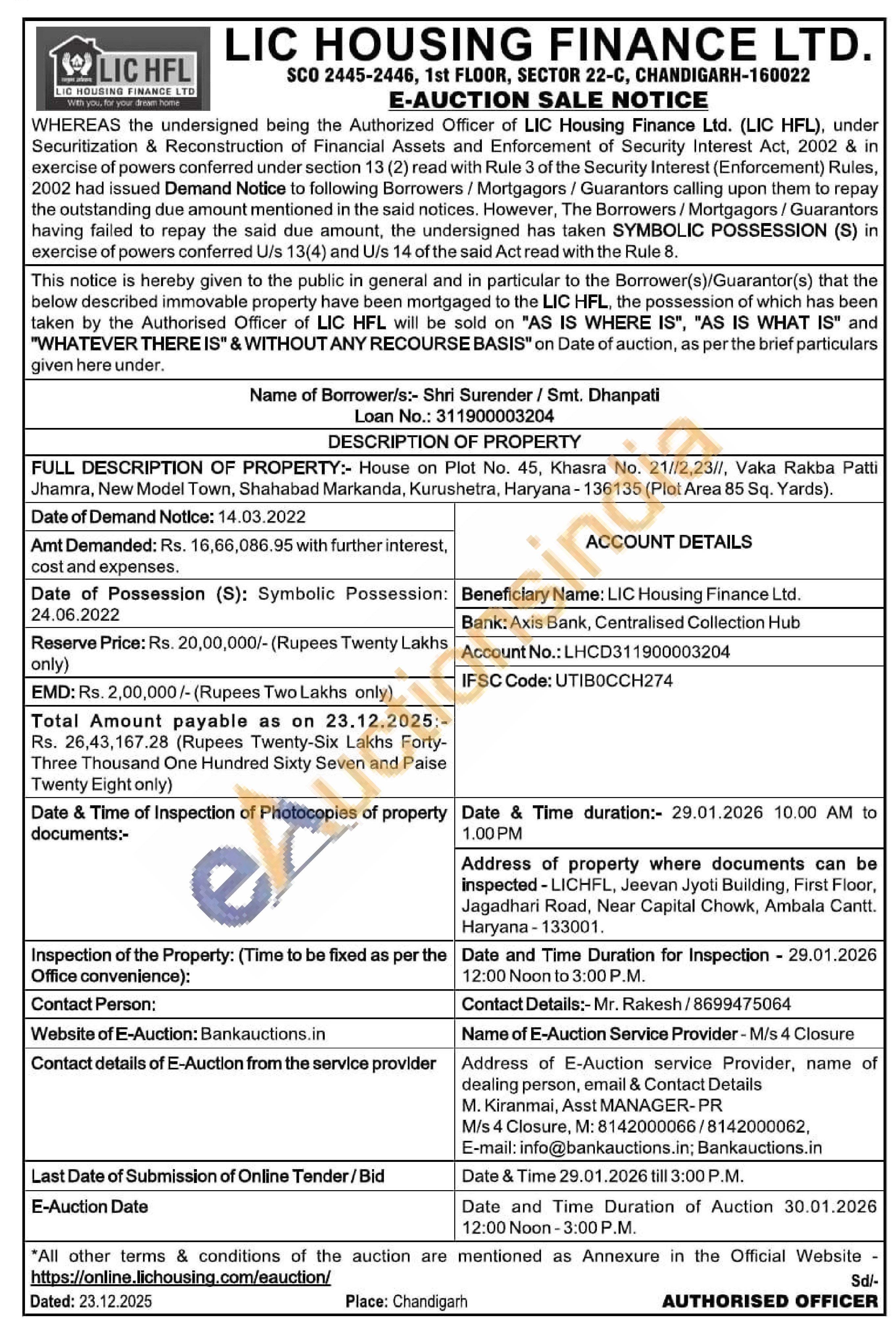 House on Plot No. 45, Khasra No. 21//2,23/1, Vaka Rakba Patti Jhamra, New Model Town, Shahabad Markanda, Kurushetra, Haryana-136135 (Plot Area 85 Sq. Yards).