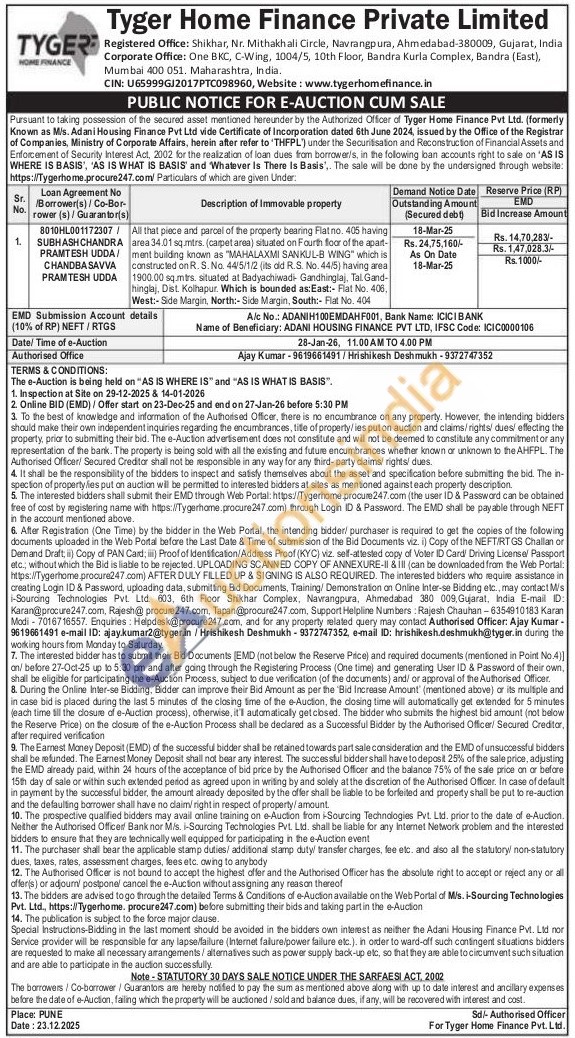 All that piece and parcel of the property bearing Flat no. 405 having area 34.01 sq.mtrs. (carpet area) situated on Fourth floor of the apart-ment building known as "MAHALAXMI SANKUL-B WING" which is constructed on R. S. No. 44/5/1/2 (its did R.S. No. 44/5) having area 1900.00 sq.mtrs. situated at Badyachiwadi- Gandhinglaj, Tal. Gandhinglaj, Dist. Kolhapur. Which is bounded as: East:- Flat No. 406, West:- Side Margin, North:- Side Margin, South:- Flat No. 404