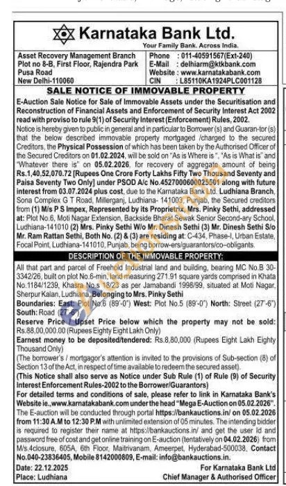 All that part and parcel of Freehold Industrial land and building, bearing MC No.B 30-3342/26, built on plot No.6-min, land measuring 271.91 square yards comprised in Khata No. 1184/1239, Khasra Nos 18/23 as per Jamabandi 1998/99, situated at Moti Nagar, Sherpur Kalan, Ludhiana, Belonging to Mrs. Pinky Sethi Boundaries: East: Plot No.6 (89-0) West: Plot No.5 (89-0) North: Street (27-6") South: Road (27-6