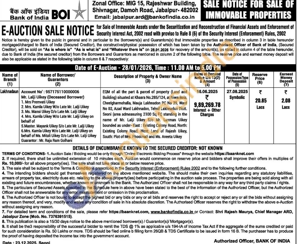 EQM of all the part & parcel of property (Land and Building) situated at Khasra No.285/124, at Niwaritola, Cheelgharmohalla, Mauja Lakhnadon PC No 39, Ward No 02, Azad Ward Lakhnadon, Tehsil Lakhnadon Distt. Seoni (area admeasuring 2100 Sq Ft) standing in the name of Mr. Lalji Uikey S/o Mr. Laxman Uikey bounded as under-East: Existing Colony Road, North: Existing Colony Road, West: Land of Rajesh Uikey, South: Plot of Mrs. Phoolmati and Ms. Aneeta Uikey